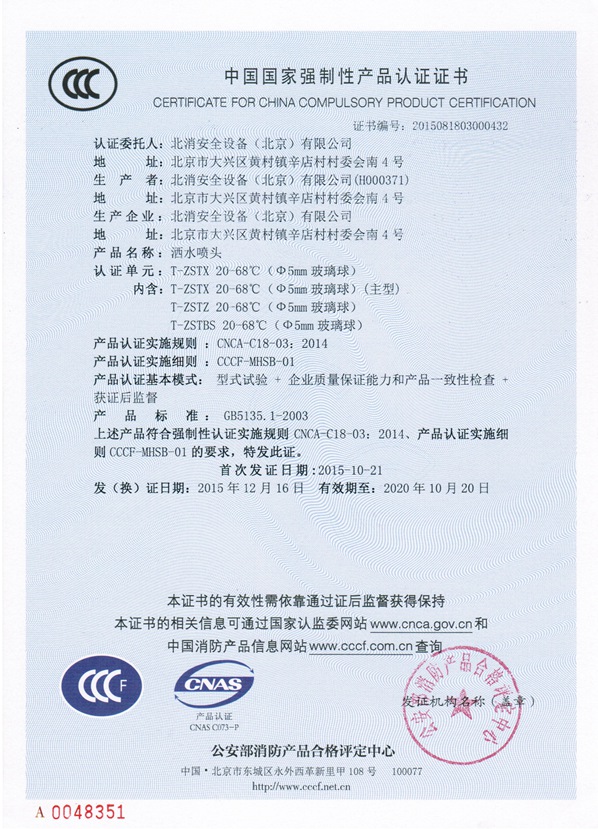 ZST型闭式玻璃洒水喷头是《自动喷水灭火系统》中关键的热敏感元件,玻璃球体内充有不同膨胀系数的有机溶液,受不同温度的热膨胀后,玻璃球体破碎,管路内的水流喷向不同设计的溅水盘,向上,向下或向侧一方喷洒,从而达到自动喷水灭火的目的。适用于环境温度不低于4℃,且不高于70℃的工厂、医院、学校、机场、商场、宾馆、餐厅、娱乐场所以及地下室等自动喷水灭火系统管网。 产品标准依据:CB5135.1-2003《自动喷水灭火系统第一部份:洒水喷头》